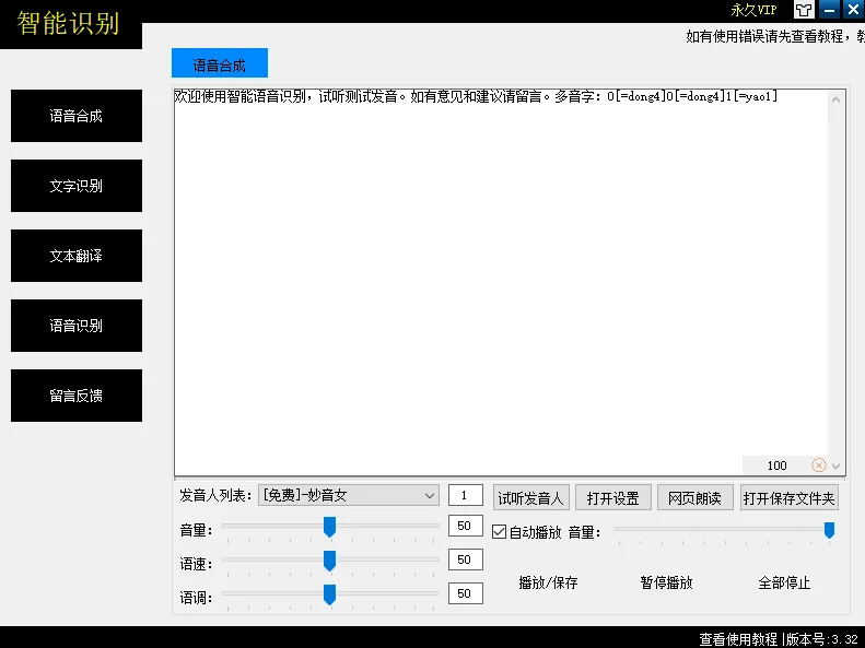 本款文字转语音工具,优点:发音种类多、无需安装直接使用,缺点:仅支持WIN系统,且只有小部分免费,其余需要付费才能使用;