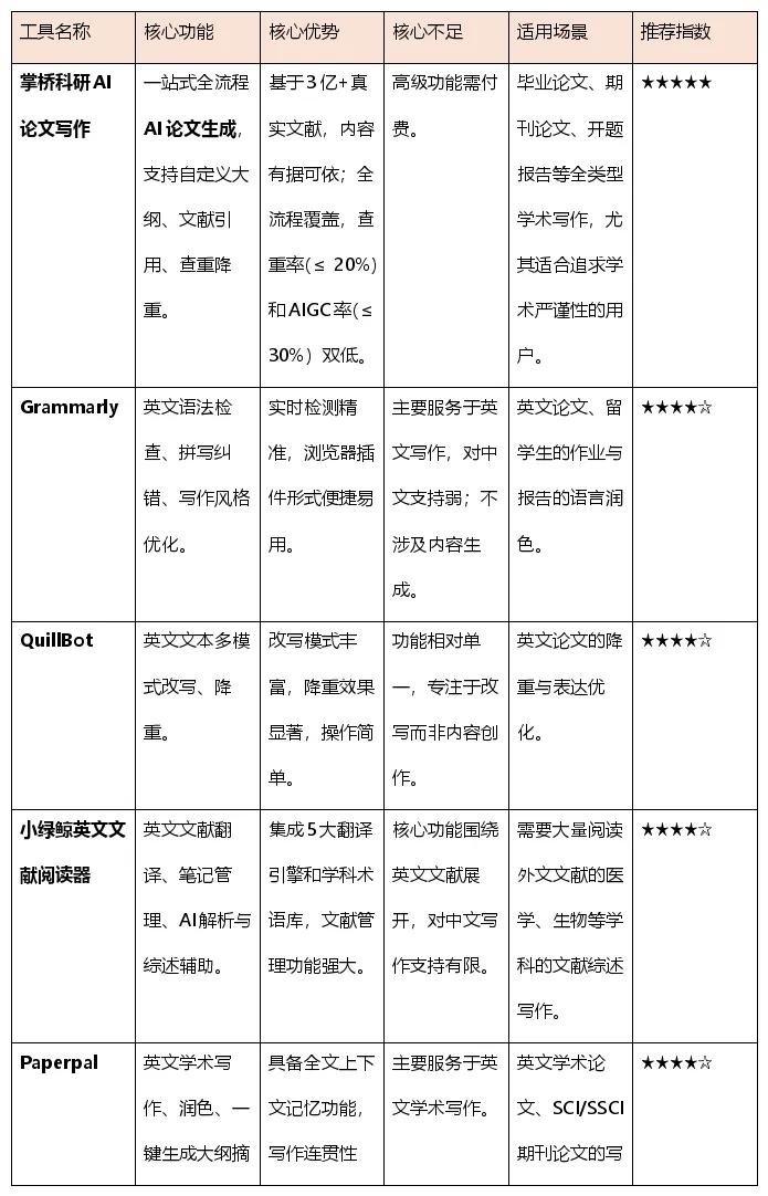 选择AI论文写作工具,关键在于匹配你的核心需求。如果你追求学术严谨性和全流程效率,需要内容有根有据、格式规范无误,那么像掌桥科研AI论文写作这样基于真实文献的一站式工具是毕业设计或期刊投稿的优选。如果你的主要需求是优化英文学术表达,那么Grammarly、Paperpal等专业润色工具则更为专注高效。而对于初步构思和头脑风暴,通用型AI如ChatGPT也能提供有价值的帮助。