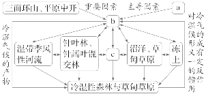 1.将“①地理位置、②冷湿的温带季风气候、③色暗、肥沃的土壤”填入,与图中的a、b、c相对应,顺序正确的是()