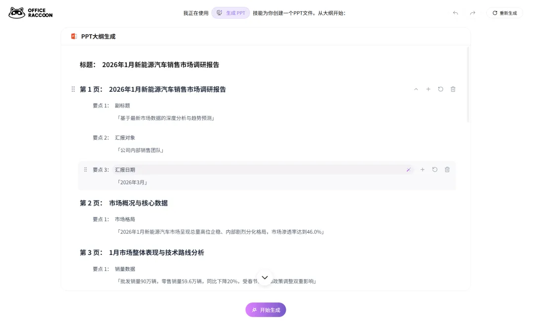 选好模板输入需求后,它先生成大纲,你可以逐条调整,满意后再正式生成PPT。