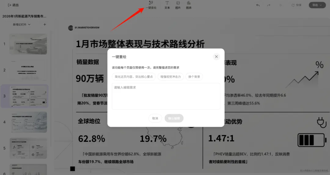 如果你觉得当前这页排版太干瘪、不够高级,直接点击顶部的“一键重绘”。