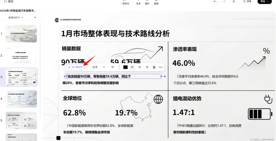 且这些图表全都能在线修改。配色不喜欢?换。想把柱状图改成饼图?点一下就行。报告里的文字分析也能直接编辑,想加点自己的观点随手就改。