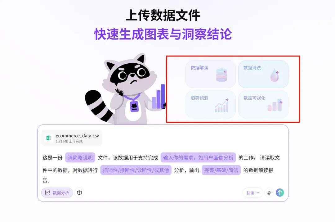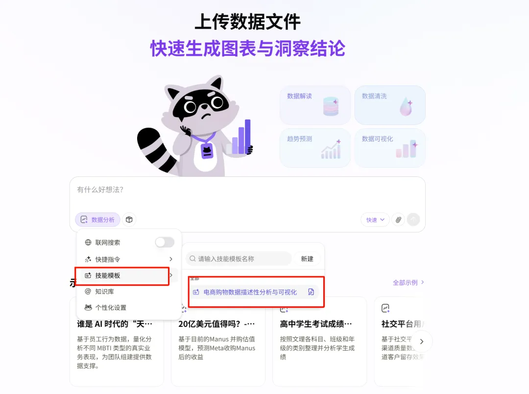 内置了几个常用的模板:数据解读、趋势预测、数据清洗和数据可视化。我们可以直接按模板进行填写,非常的便利。