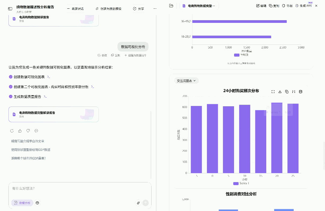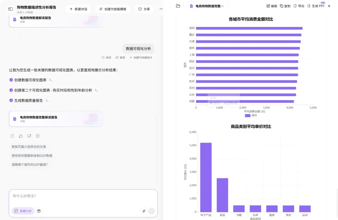 最绝的是——分析完的报告可以一键导出成PPT。数据上传→自动分析→出图表→变PPT,整个流程一气呵成,不用在多个软件之间来回倒腾。