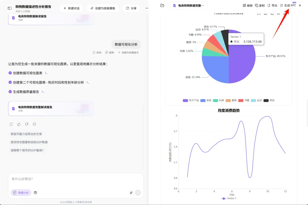 很多时候做PPT,最耗时的不是排版,而是前期的数据分析。以前要自己在Excel里折腾半天,做图表、找规律、写结论,然后再搬到PPT里。