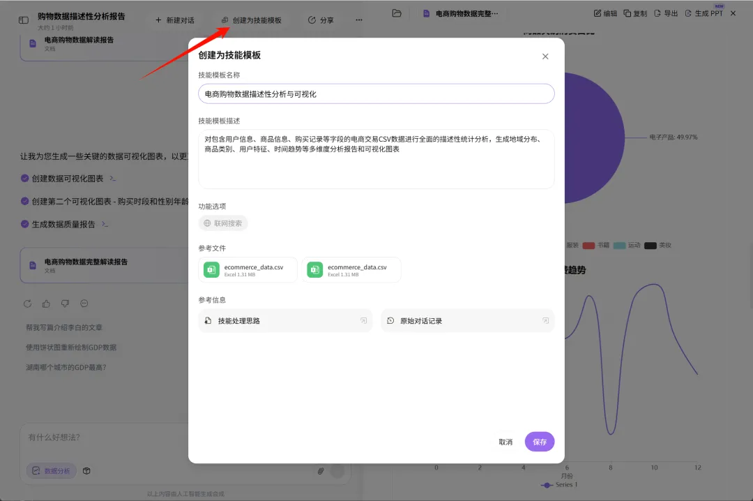 当你进行一次成功的数据分析过程,可以将本次分析过程创建为技能模板。这样后续就能使用同样的分析逻辑持续分析同类数据。