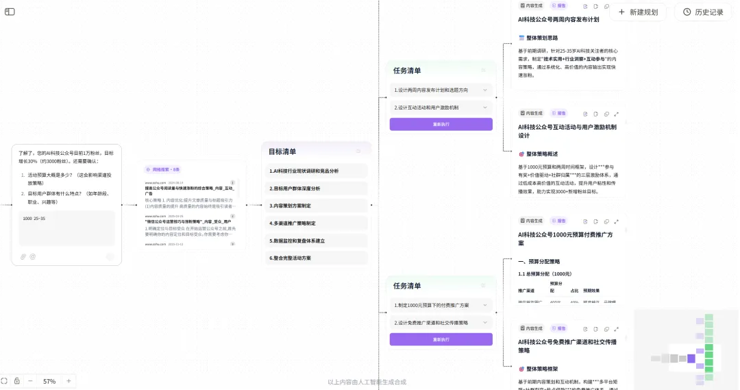做自媒体的都知道,有时候要同时推进好几个项目,脑子里乱成一锅粥。小狸试了一下,输入”帮我规划一个为期两周的公众号涨粉活动方案,包含内容策划、渠道投放和数据复盘”。