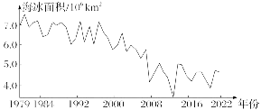北极海冰一年中会动态变化:夏季持续融化,在9月达到最小面积;冬季持续冻结,在3月前后达到最大面积。读1979—2022年北极9月海冰面积变化图,完成9~10题。