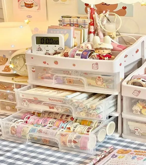 桌面零散小物件总乱糟糟?这个收纳盒简直是救星!透明材质让里面的物品一览无余,笔、梳子、化妆品小样分类放好,找东西再也不用翻箱倒柜。抽屉抽拉顺滑不卡顿,用起来超顺手,白色外观简约干净,摆在书桌上不突兀。还送同系列可爱贴纸,贴在盒子侧面或顶部,瞬间增添软萌感,和桌面风格轻松适配。把杂物都收进去,桌面立马变得整洁清爽,学习工作时看着都舒心不少~