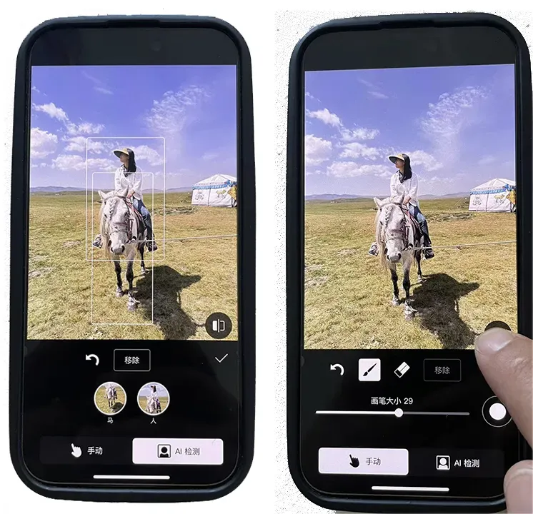 照片内容移除,可以将照片中的路人移除,使用AI快速检查照片中的全部物品自动筛选,最后点击移除即可,不够完美还可以使用手动画笔进行微调。