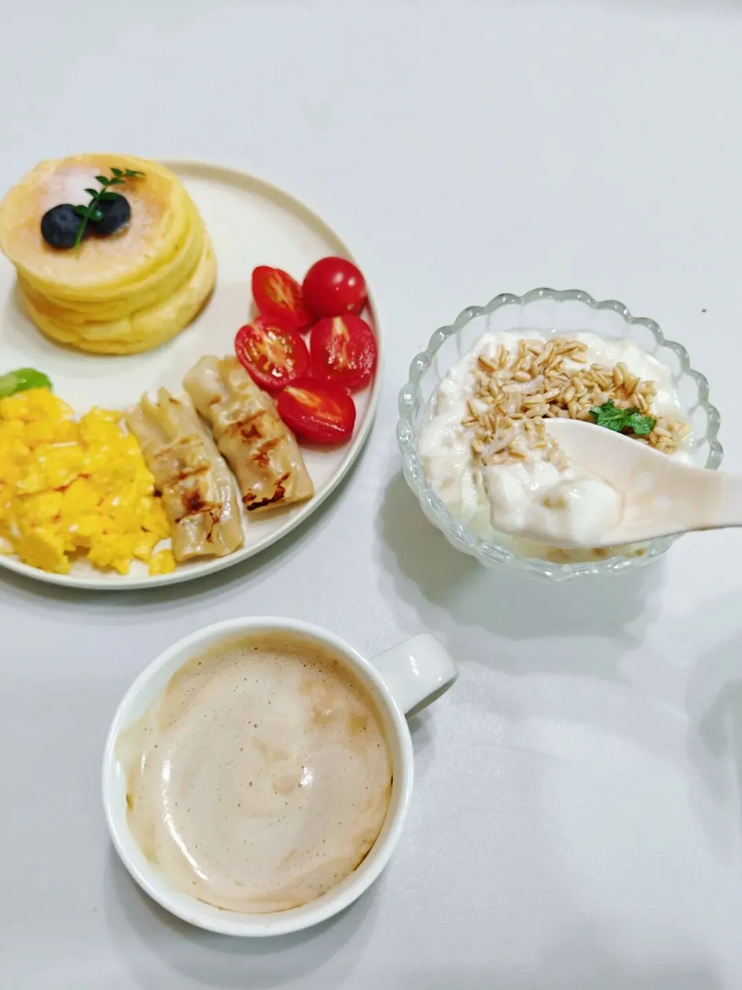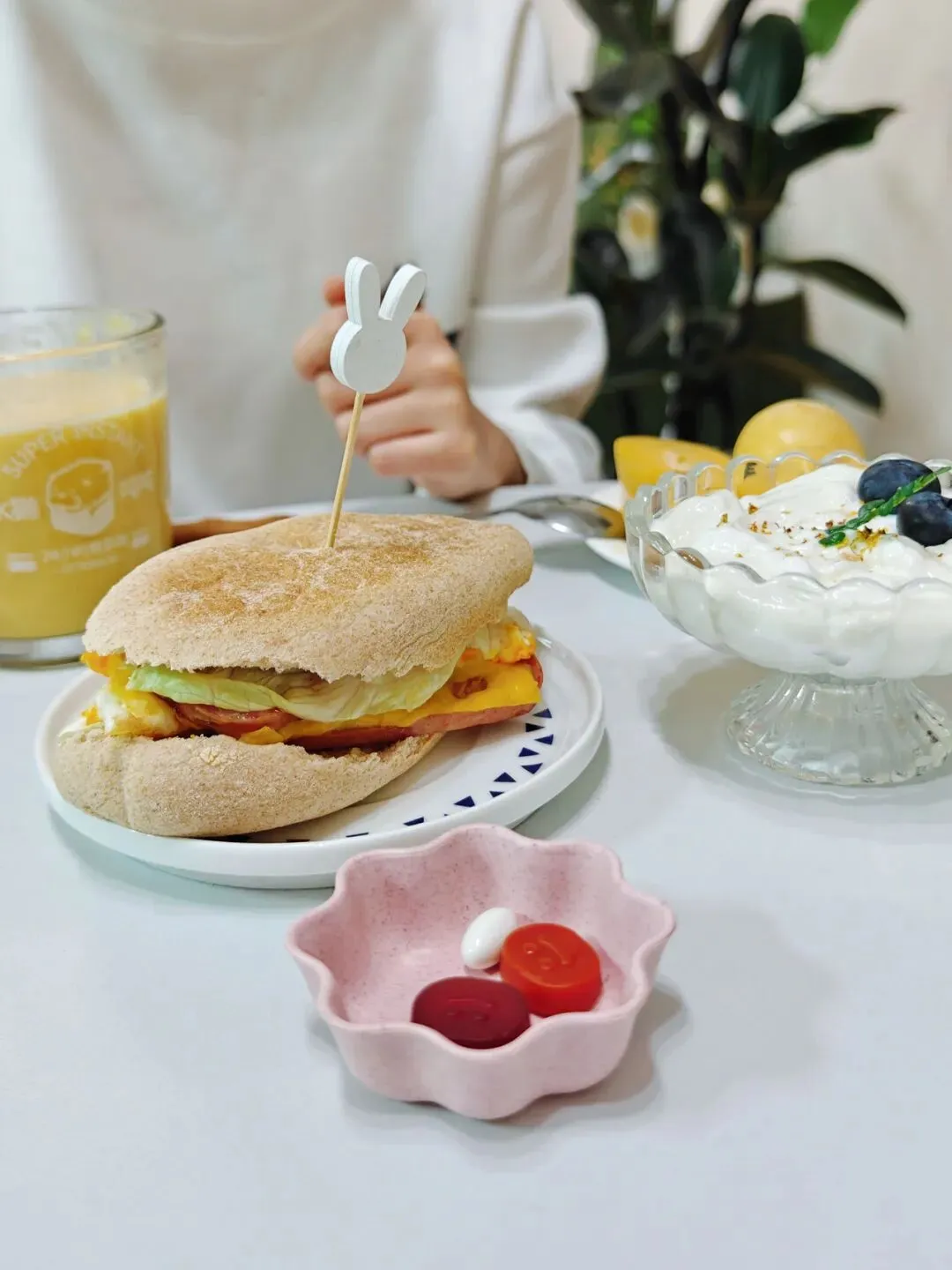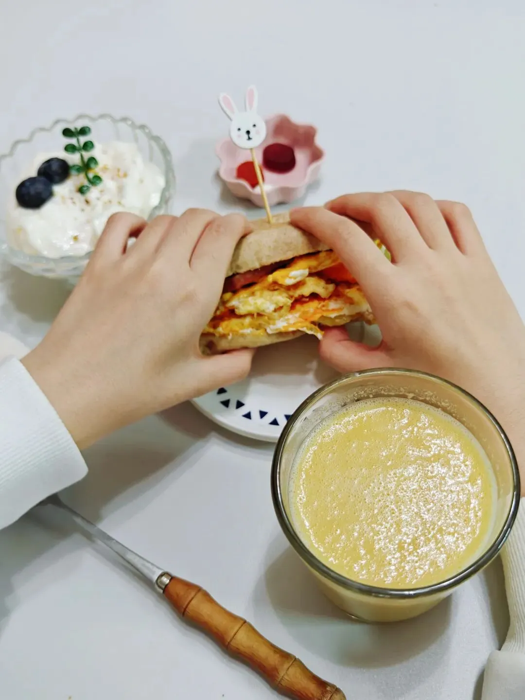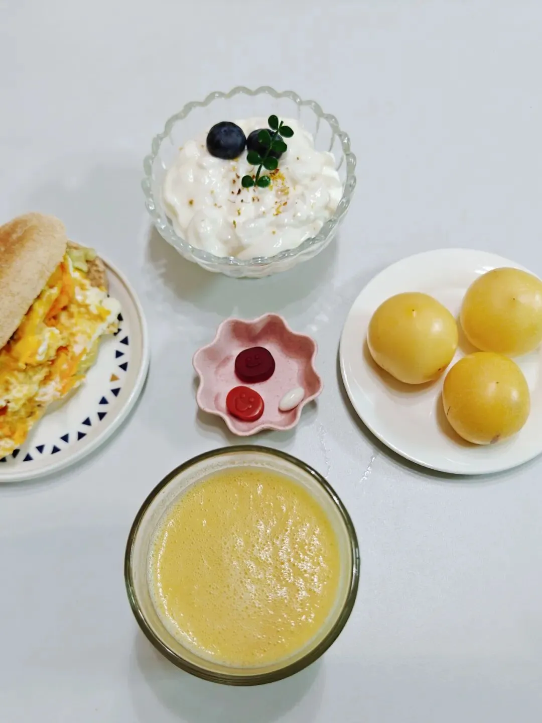 茉莉早餐·2026.3.16|恰巴塔三明治(火腿鸡蛋芝士)+鲜榨玉米汁+人参果+蓝莓酸奶杯🫐