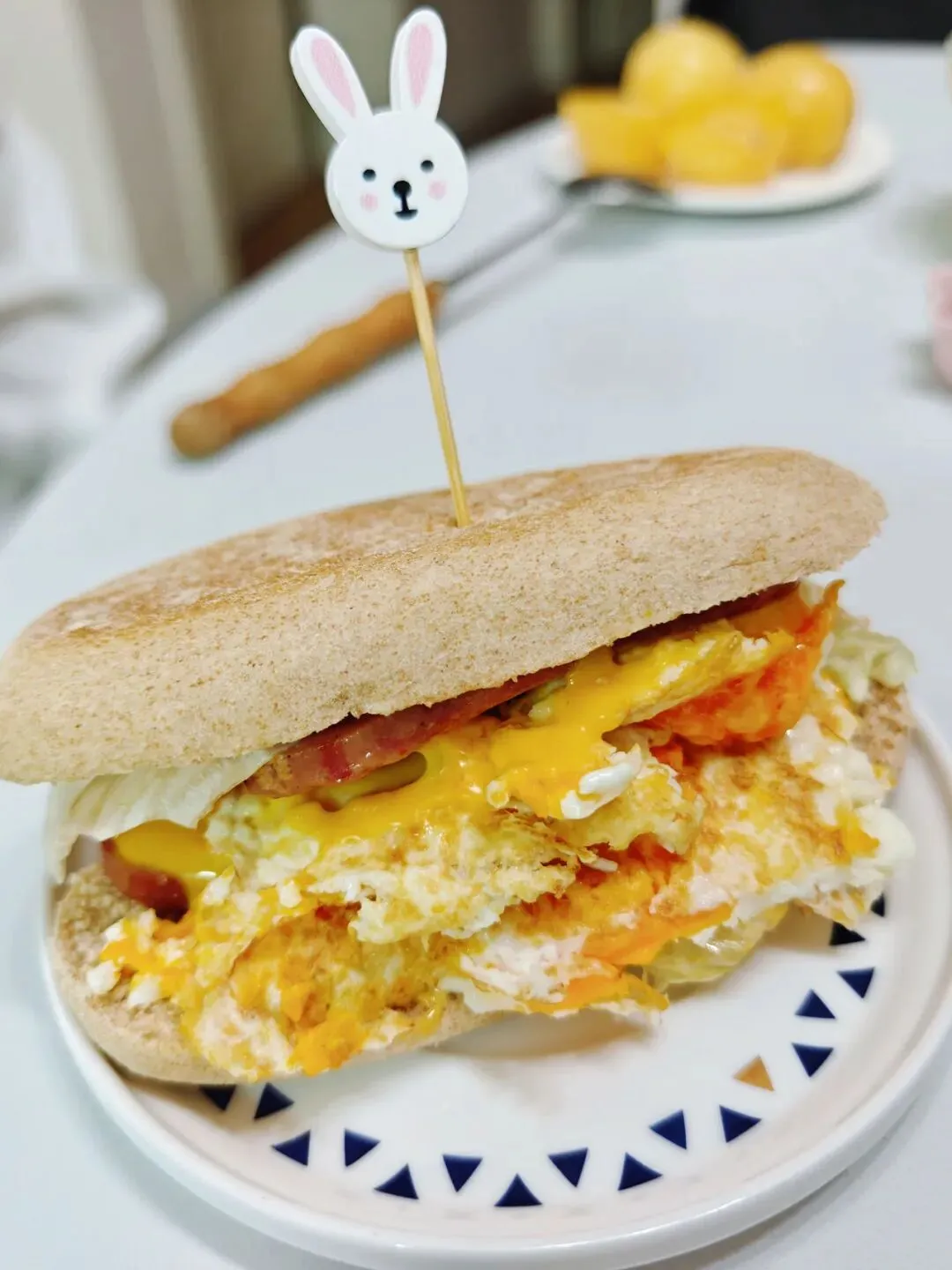 4、在恰巴塔里依次放上生菜、煎蛋、火腿+融化的芝士片。如果你喜欢口味再丰富点,可以在恰巴塔内侧抹上沙拉酱或番茄酱。