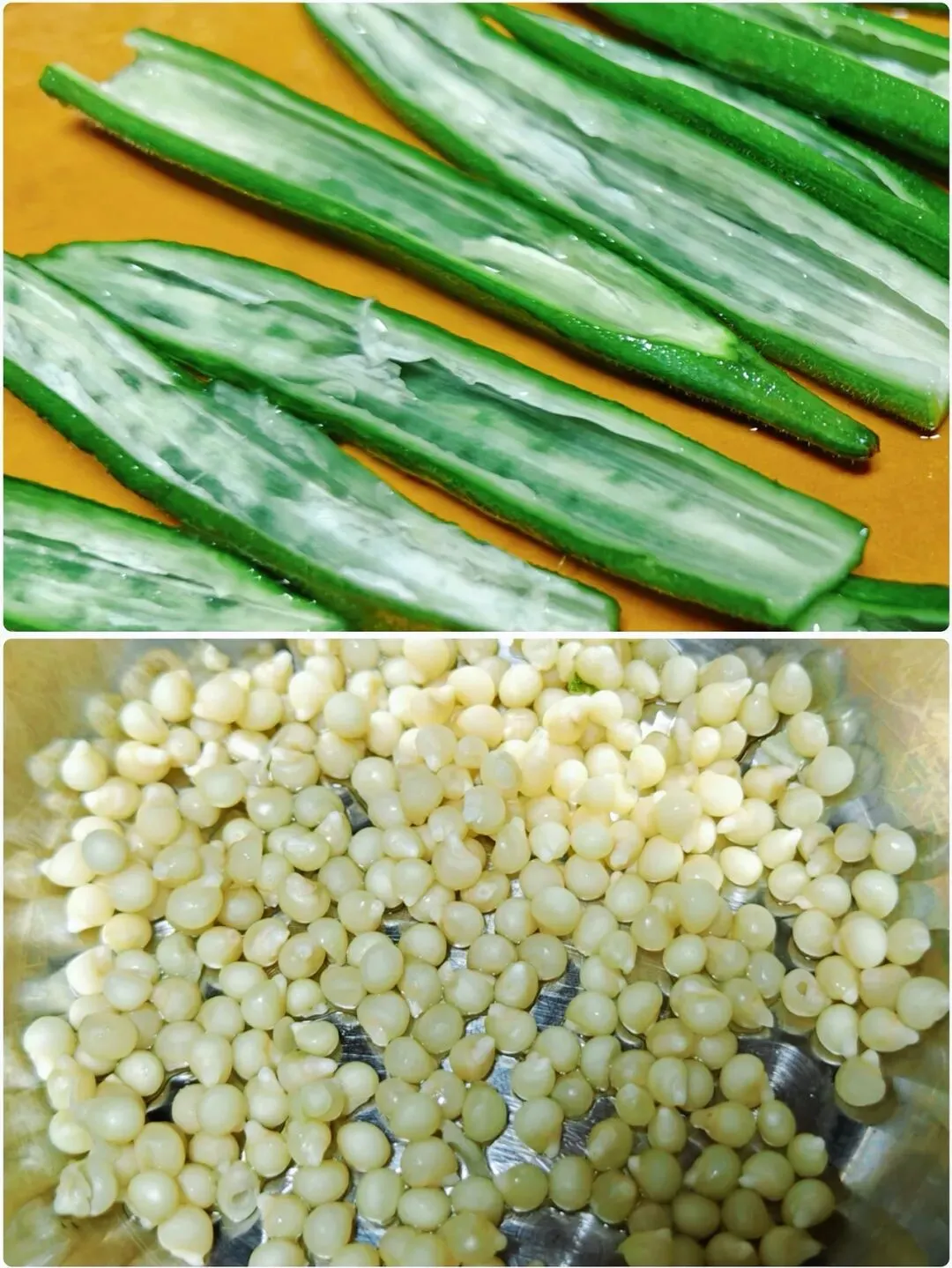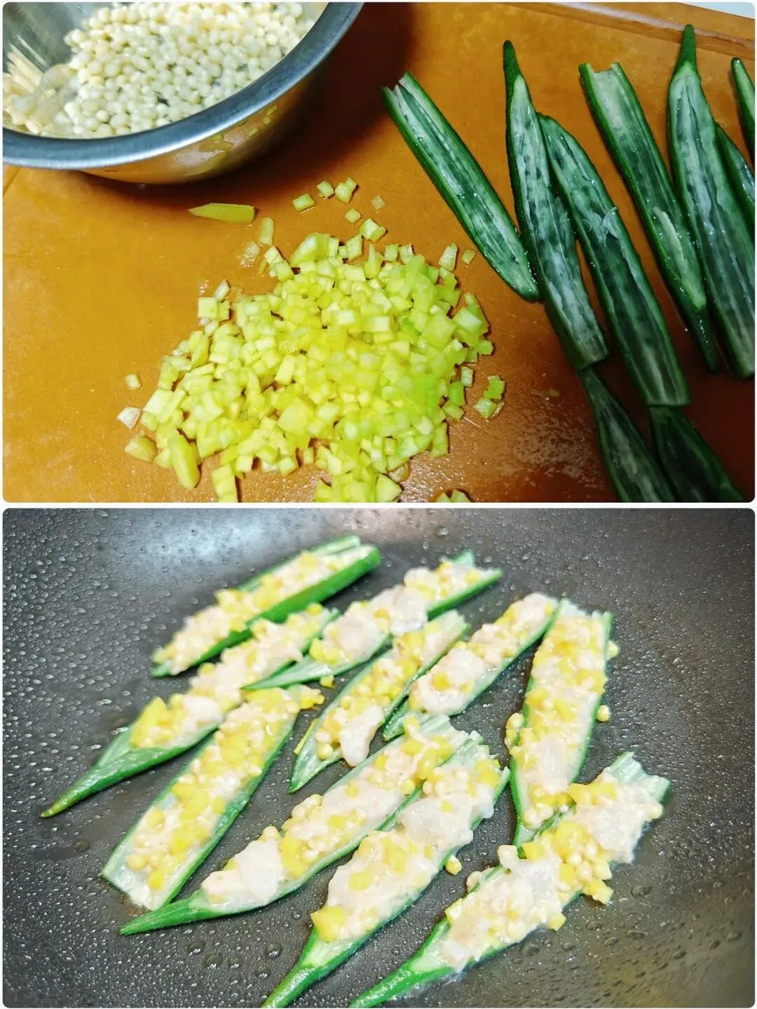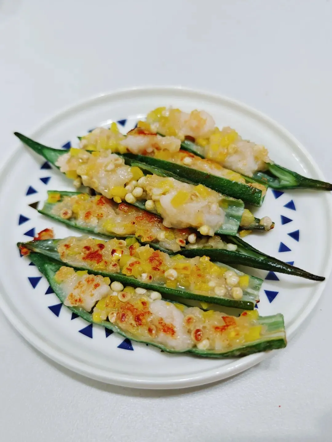 3、秋葵沸水煮两分钟沥干水分,刷上一层淀粉,挤入虾滑。