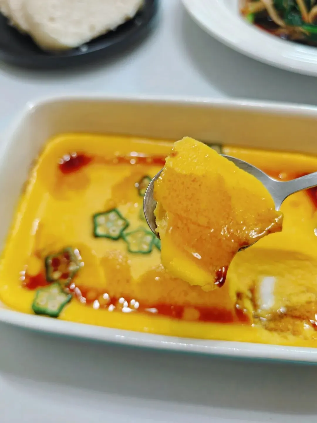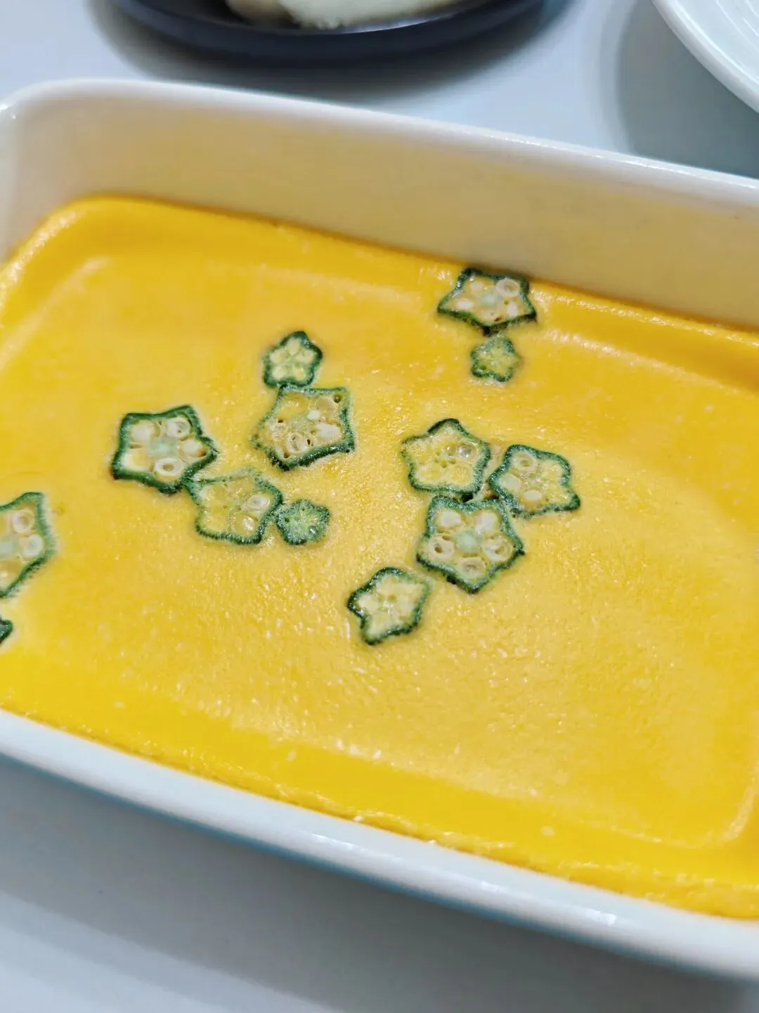 3、蛋液倒入碗中,表面撇去泡沫,摆上秋葵片。