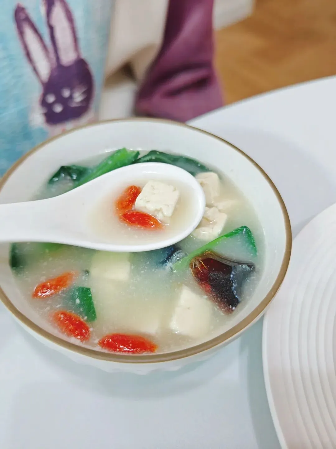 3、放入豆腐煮5分钟,再下青菜和枸杞煮1分钟。