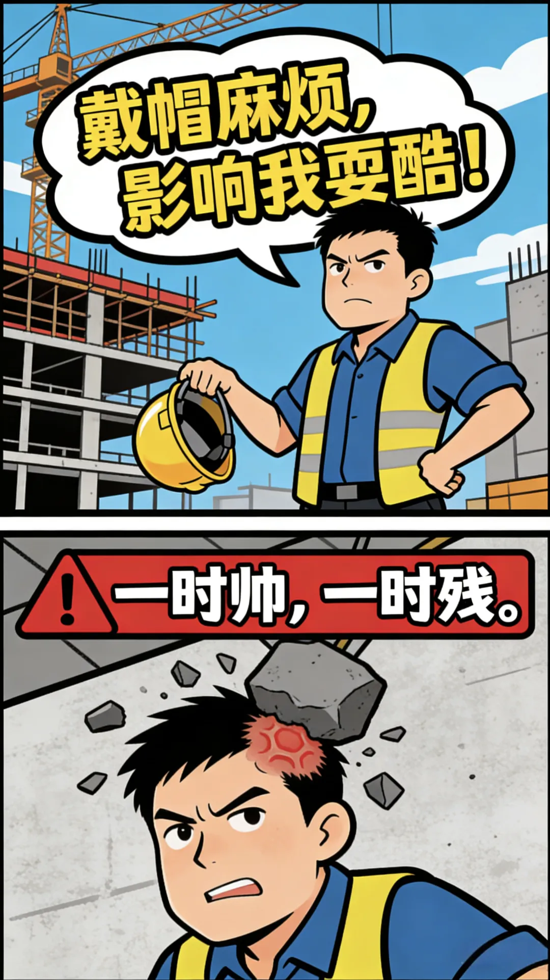 嫌麻烦、想耍帅,不戴安全帽上岗。高空坠物不会留情,受伤只在一瞬间。
