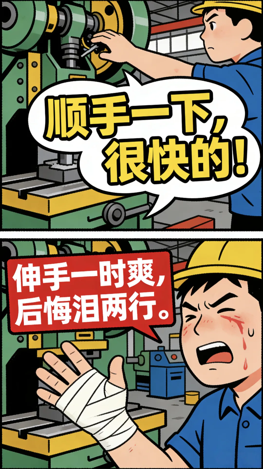顺手清理、伸手调试,最容易被机器夹伤。一时方便,可能换来终身伤痛。