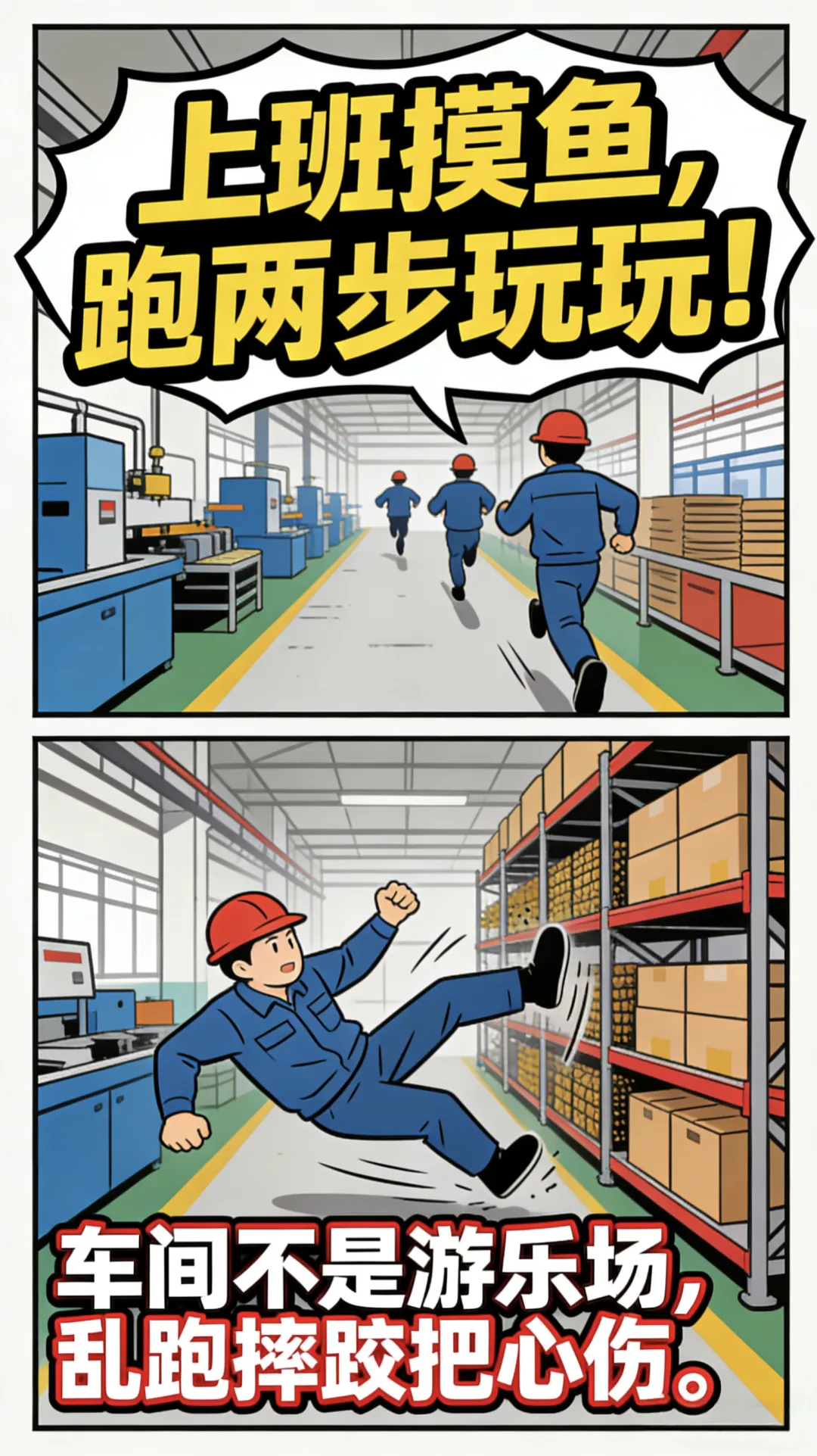 车间不是游乐场,奔跑、追逐、打闹极易滑倒摔伤。