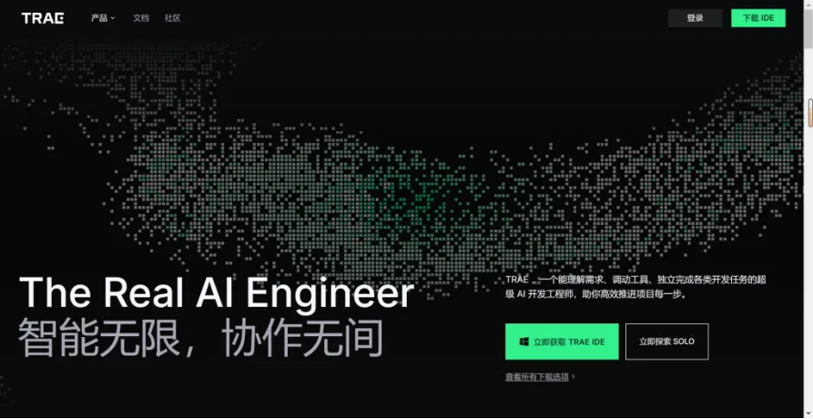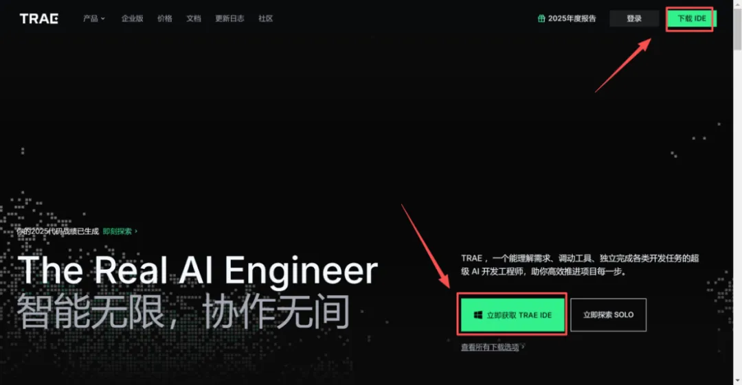 首先访问:https://www.trae.cn,单击首页右上角的“下载IDE”或右下角的“立刻获取TRAE IDE”均可,如下图所示。