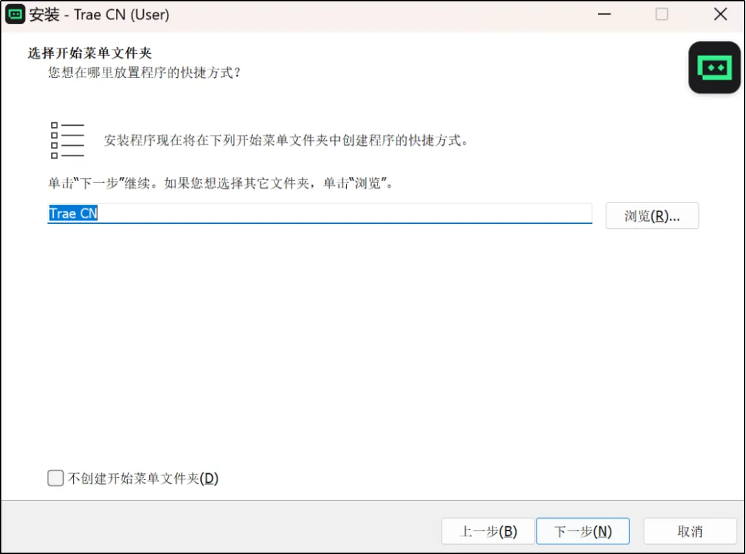 此步骤问是否要在开始菜单文件夹中创建程序快捷方式,若不希望创建,就把“不创建开始菜单文件夹”勾上,希望创建则不要勾选。然后单击“下一步”。