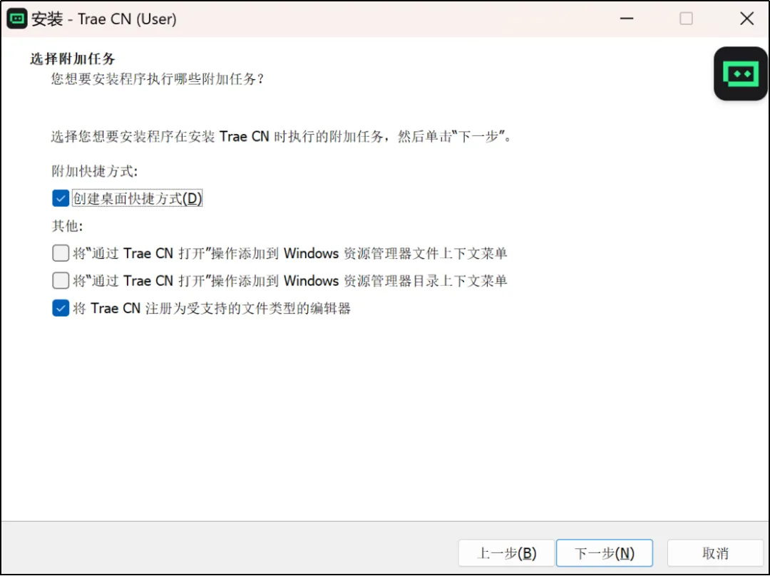 此步骤可以选择是否“创建桌面快捷方式”,以及其他配置选项,可自行根据需要勾选。示例这里勾选了第一个和最后一个选项,供参考。勾选完毕后单击“下一步”。