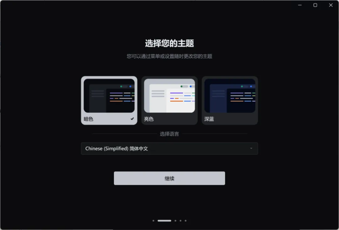 当前页面可以选择开发界面的主题颜色,目前有3款主题(暗色、亮色、深蓝)可选,请根据个人喜好选择主题风格,并单击“继续”进入下一页。