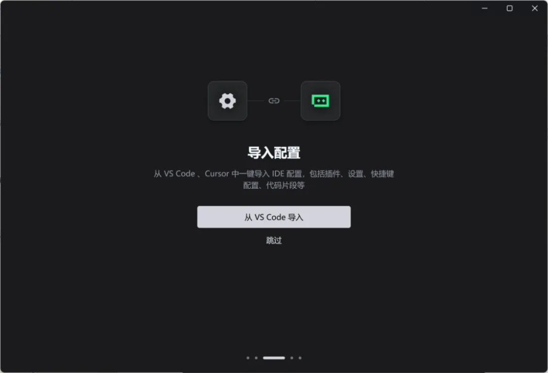 当前页面可以导入之前已经在使用的一些开发工具中的配置,例如VS Code、Cursor等,包括其中的插件、常用的快捷键、代码片段等配置。如果暂时无需要,可单击“跳过”进入下一页。