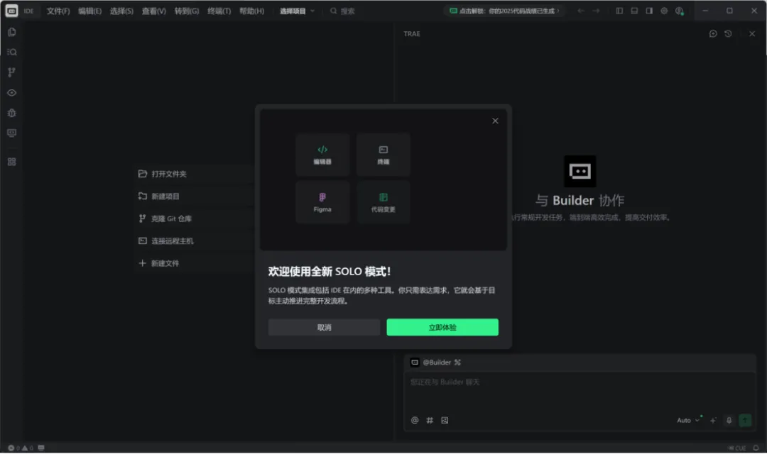 弹窗是新出的SOLO模式,可以先单击“取消”看一下IDE模式。