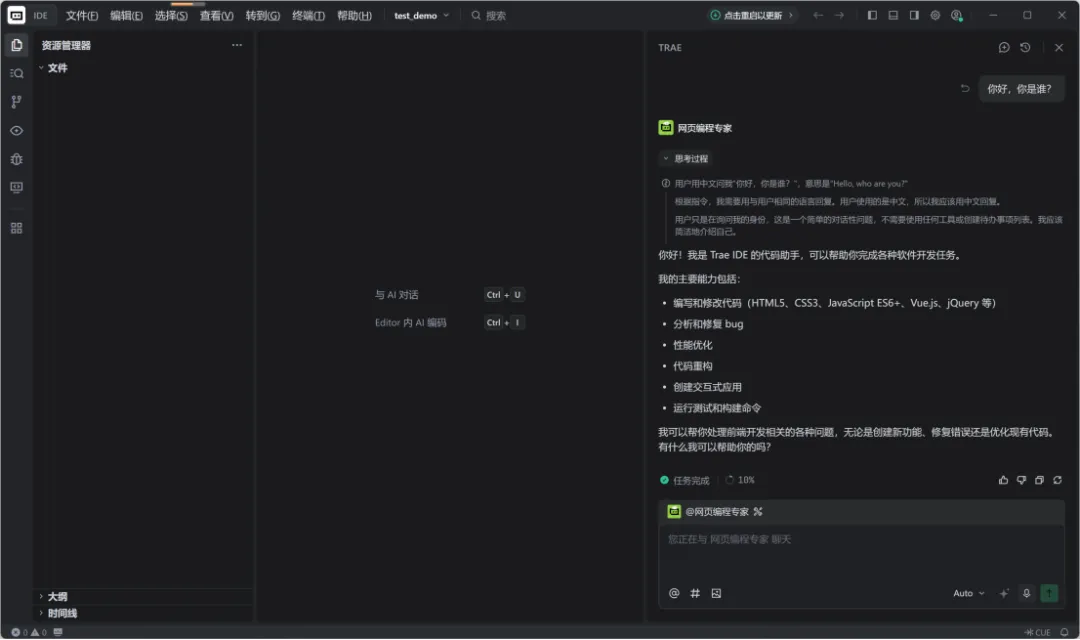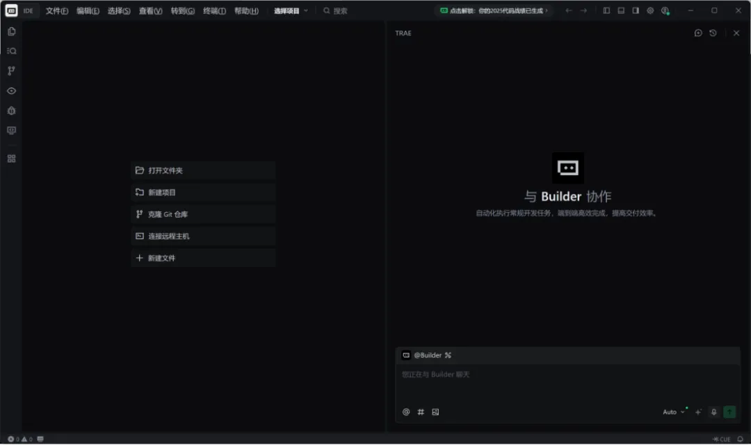 此时就是TRAE的常规IDE模式了,左上角也可以一键切换到SOLO模式或回到IDE模式。