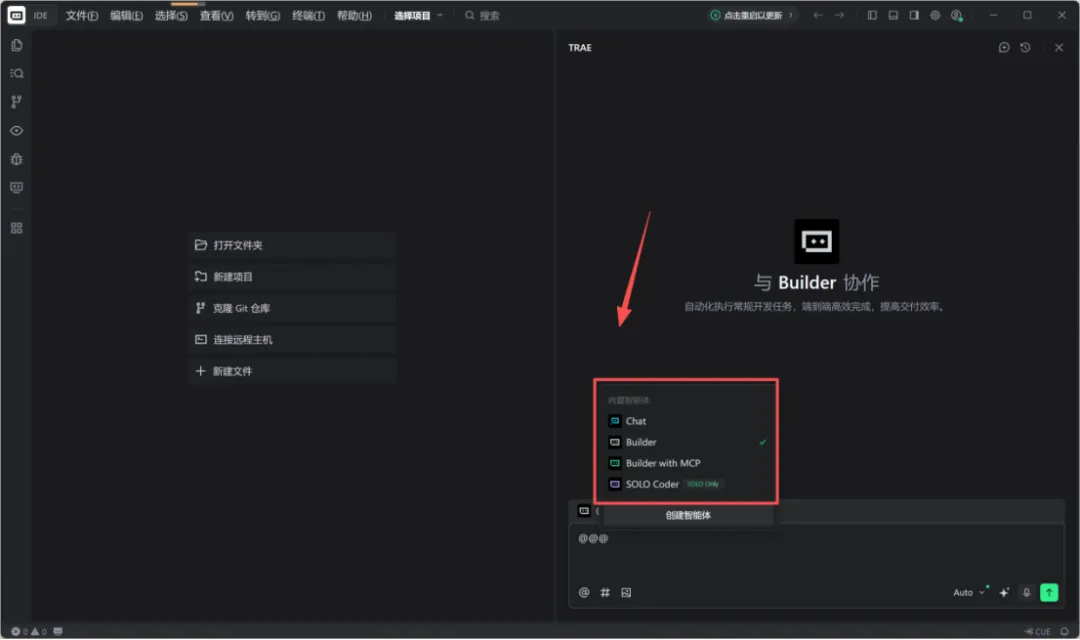 TRAE的IDE内提供系统自带的内置智能体,如下图。