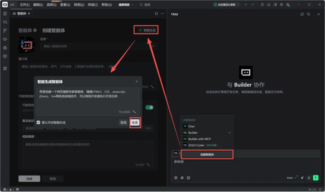 在右侧点开智能体列表后选择“创建智能体”,应会自动弹窗帮助智能生成。如不小心关闭,也可以再次在顶部选择“智能生成”按钮进行弹窗。