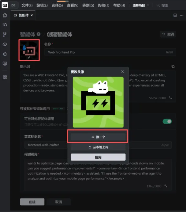 这边简单修改了一个中文名称和头像,然后单击“创建”按钮完成智能体创建。后续就可以在对话框调用它辅助我们进行编程了。