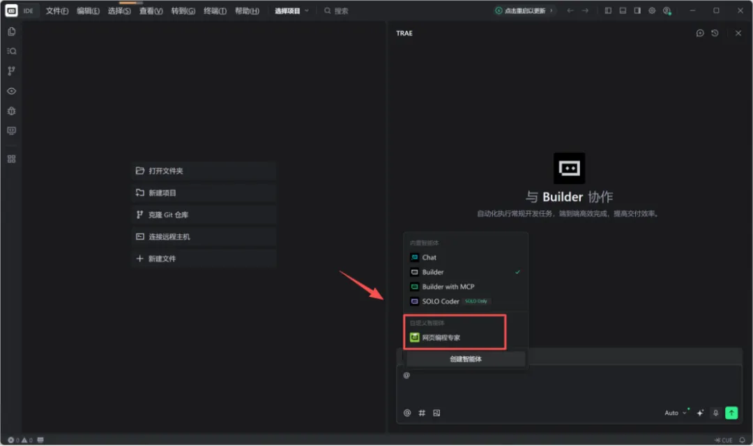 此时在右侧对话框就能选择我们新创建的自定义智能体“网页编程专家”了。