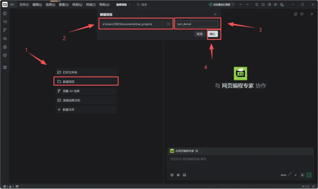 如下图所示,单击左侧“新建项目”按钮,顶部自定义项目路径地址、填写一个项目名称(例如test_demo),单击“确认”按钮完成项目创建。