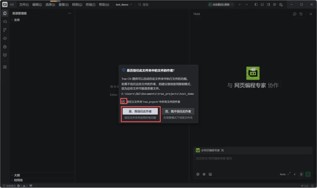 首次创建完成后如果弹窗让确认是否信任此文件夹中的文件作者,请勾选“信任父文件夹xxx中所有的文件作者”并单击“是,我信任此作者”。