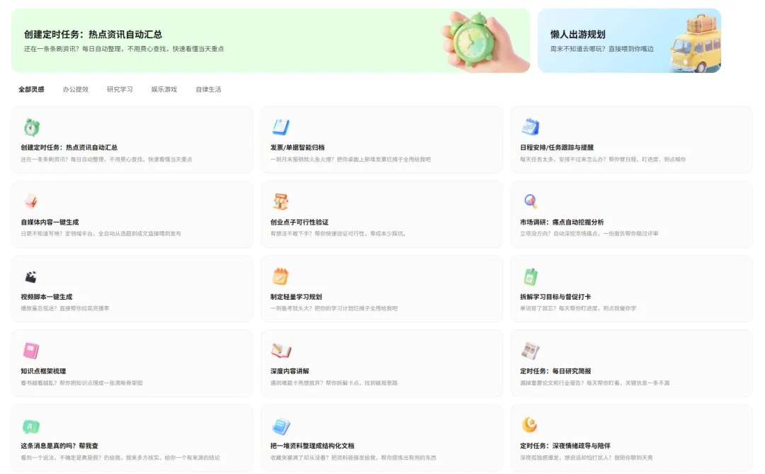 现在灵感广场里预置了一堆常用任务,你不用自己想指令,直接点”立即使用”,它就自动加载Skills开始干了。