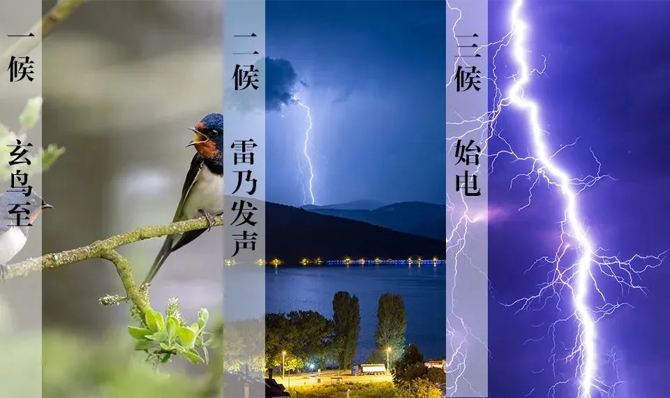 先民以五日为一候,细察春分时节的自然变迁,将其物候特征凝练为三候,层层递进,生动展现了暮春时节万物繁盛的鲜活图景:“一候玄鸟至;二候雷乃发声;三候始电。”