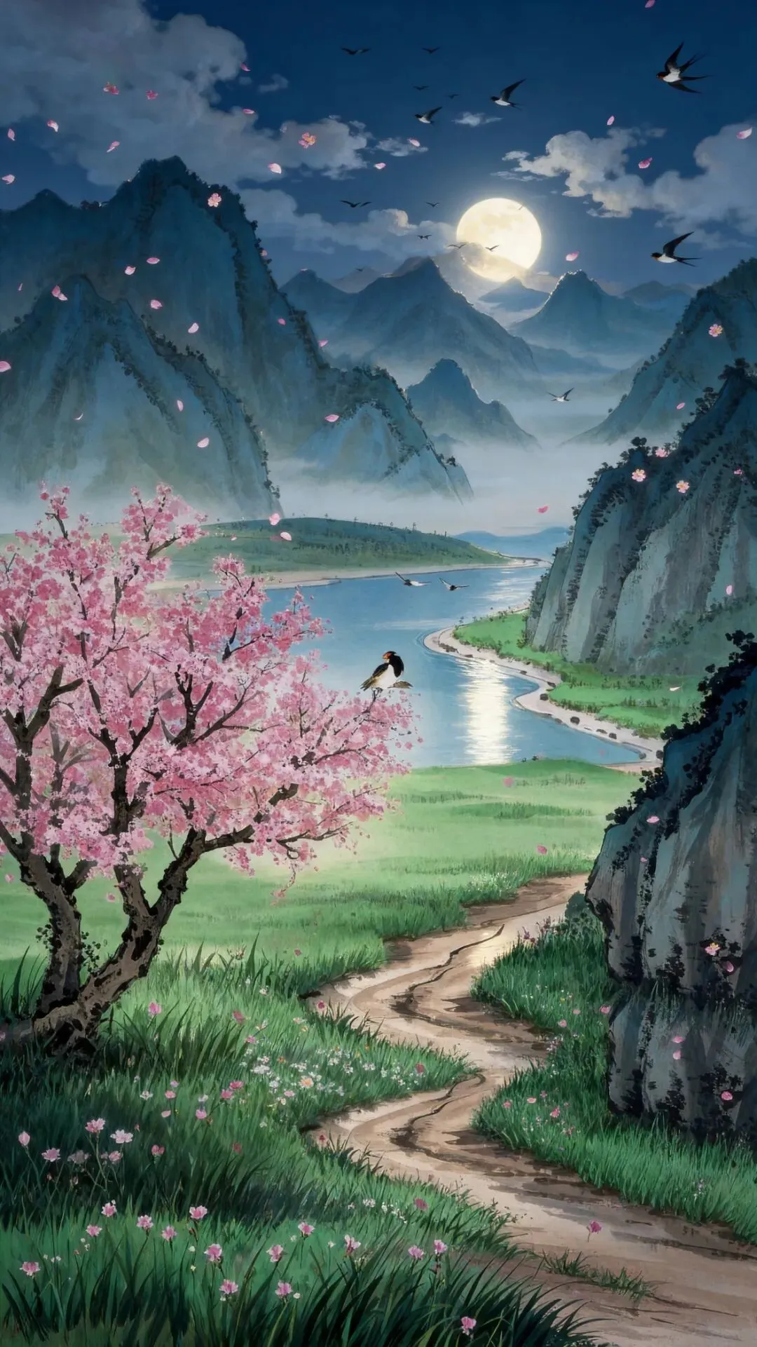 这是一首春分的佳作,以细腻的笔触描绘了此时的自然景致与人文情怀。开篇点明时节,春分正值仲春,春色过半,温润而繁盛;第二句,勾勒出夜晚的静谧之美,月光洒在绿野上,天空中飘着零星的云朵。动静结合,燕子成群飞舞,桃花、杏花纷纷飘落,既有春日的灵动,也有几分淡淡的怅惘。结尾“思妇高楼晚,歌声不可闻”,借思妇的思念之情,为全诗增添了几分柔情,将春日的温润与人文的温情相融,意境深远,情感真挚。