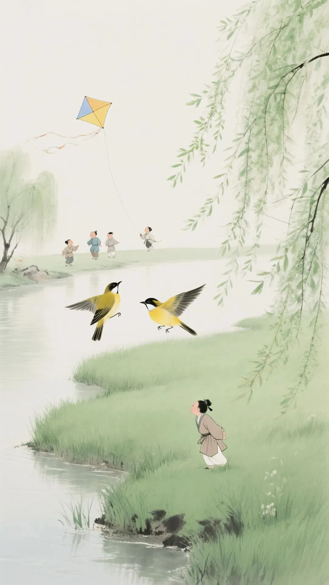 诗中虽未直接提及春分,却精准刻画了春日盛景与民俗乐趣,是流传最广的早春诗作之一。“草长莺飞二月天,拂堤杨柳醉春烟”这句勾勒出小草蓬勃生长,黄莺自在飞翔,杨柳依依,拂过堤岸,在春日的烟雾中显得格外柔美,尽显“春和景明”的韵味。后两句捕捉到放风筝的民俗场景,孩子们早早放学回家,趁着和煦的东风放飞风筝,欢声笑语,充满了童真与欢乐,也让春日的画面更加生动鲜活。