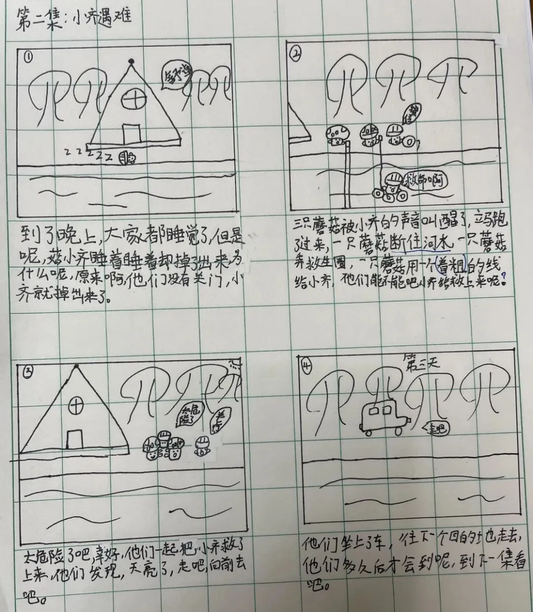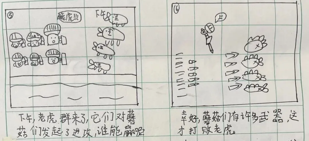 最近孩子想挑战写漫画故事,平日里他特别喜欢蘑菇,提出想写一个关于蘑菇的“长篇”故事。不知道以他目前的能力,能写出什么样的内容,我也十分好奇。
