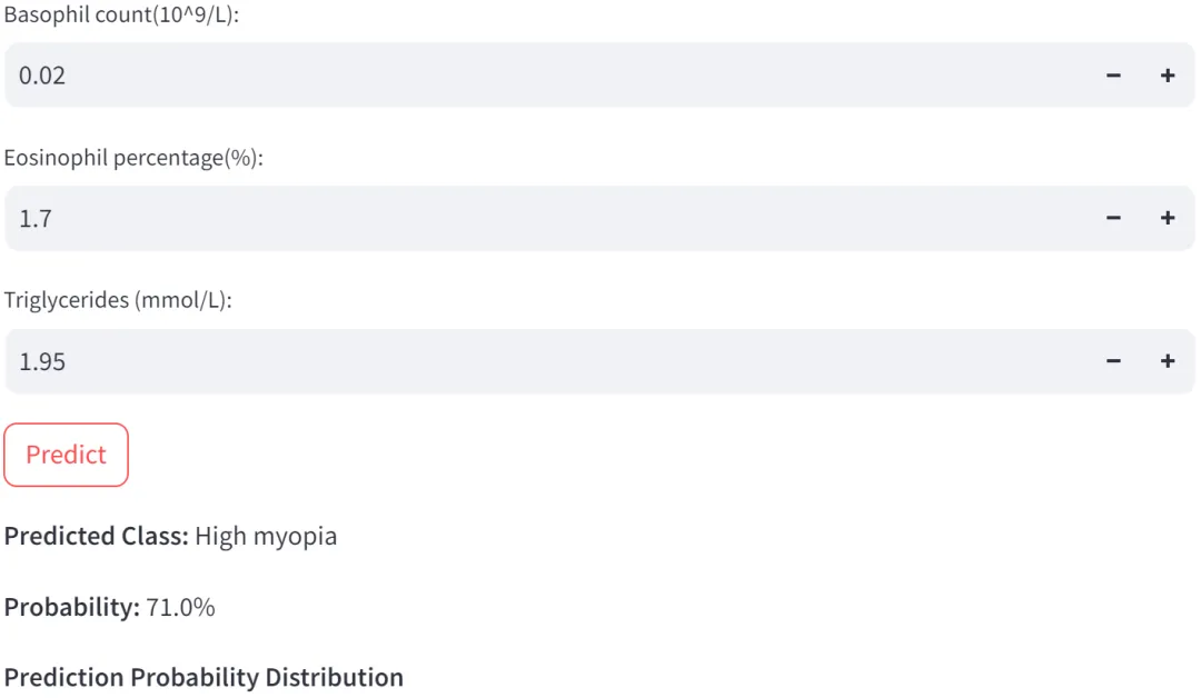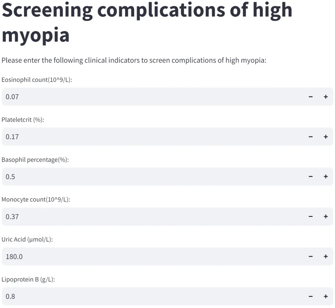 4、临床转化:开发免费在线网页工具(https://high-myopia.streamlit.app/),输入9项血液指标即可实时输出高度近视及5类并发症的风险概率,实现临床快速应用,点击链接进去如下图所示。