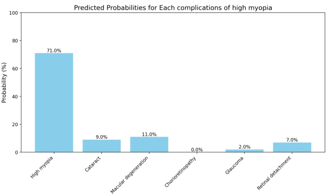 基于9项常规血液指标的随机森林模型可实现高度近视及5类并发症的高效、低成本筛查,在健康体检、社区、基层医疗场景中可作为一线初筛工具,筛选出高风险人群后再进行眼科影像学确诊,能大幅提升筛查效率、合理分配眼科资源,尤其适合医疗资源匮乏地区。