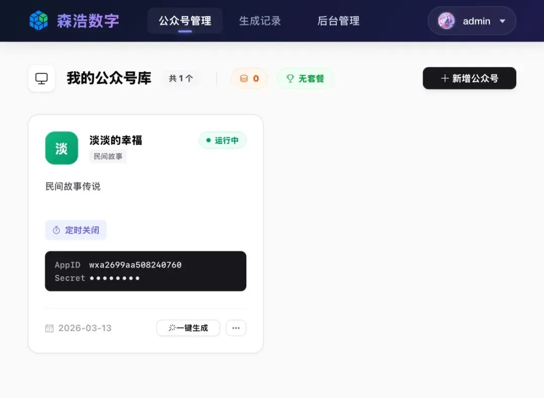 在「公众号管理」页面,点击「一键生成」,系统会根据你设定的策略自动生成新的文章到你的草稿箱。
