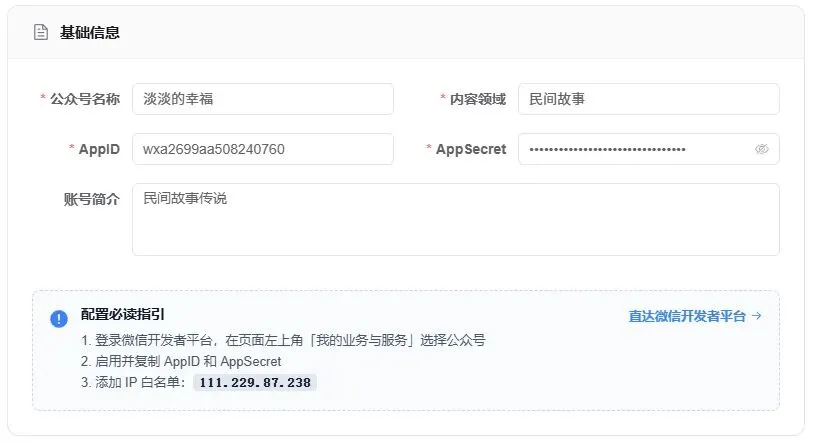 • AppID 和 AppSecret:在微信开发者平台启用并复制到配置中。