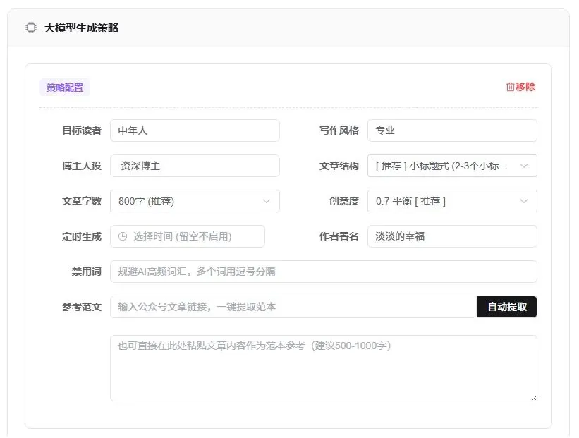定时发布:可以在策略中设置「定时生成」,不填表示不定时,让系统在你指定的时间自动生成并发布内容,实现自动化运营。