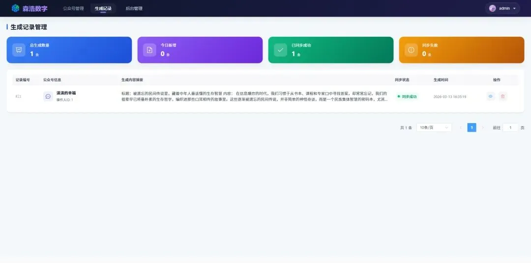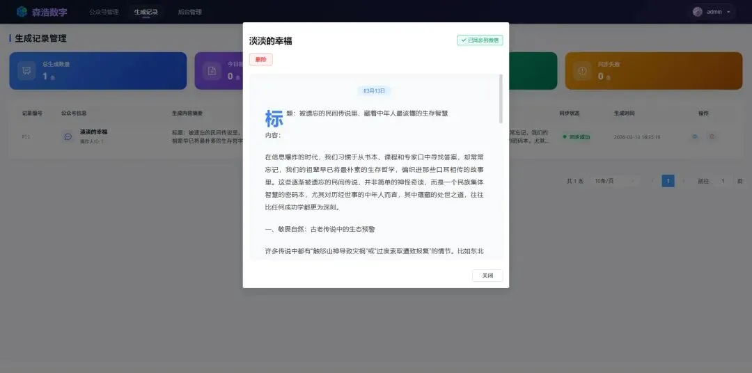 查看效果:在「生成记录」里可以随时查看历史生成的文章和同步状态