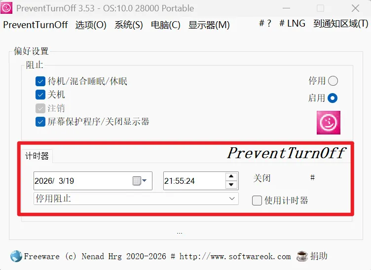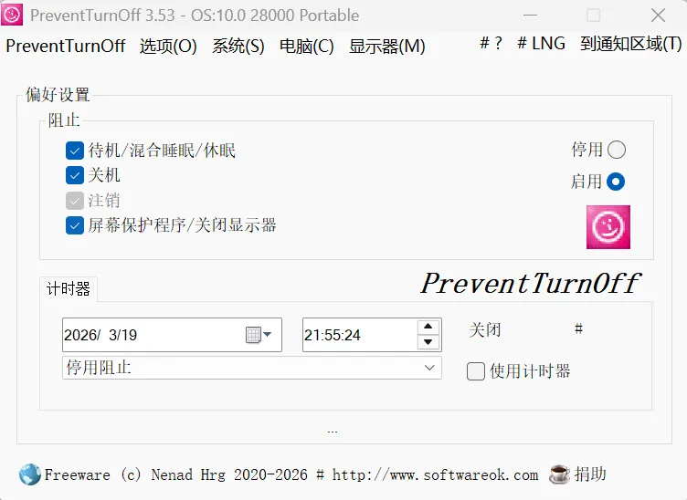仅408KB的极简工具,专门阻止电脑待机/睡眠/休眠。首次打开是外文,点击”LNG”切换简体中文。