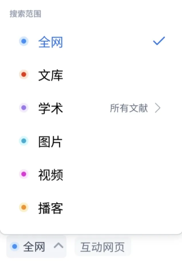 支持全网、文库、播客、学术四种搜索模式,各有不同用处:全网搜索适合查找各类资料;文库搜索方便找到知识文档;学术搜索主要用于查找专业论文和期刊;播客搜索可以查找音频内容。多种搜索方式搭配使用,能满足不同用户的各种需求。
