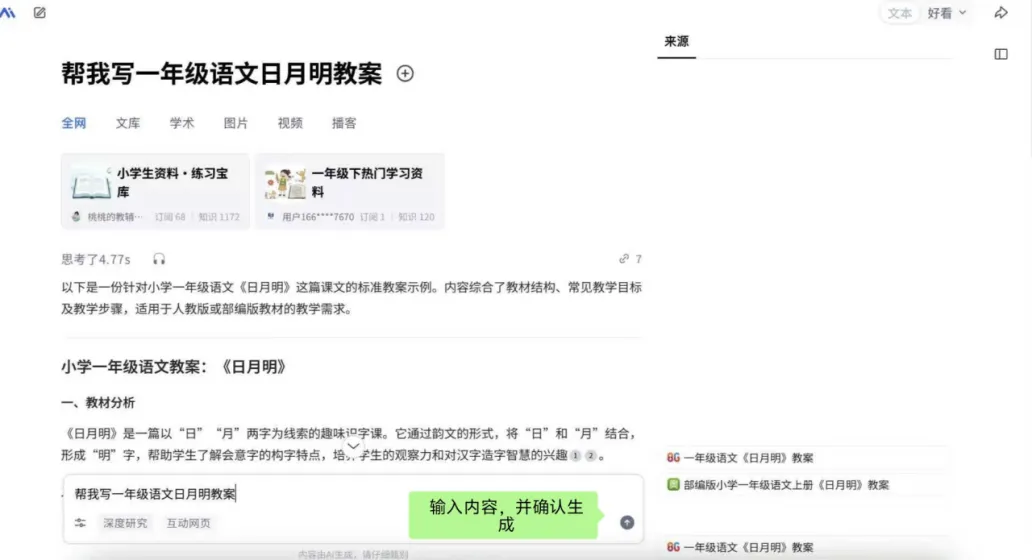 用法:直接说需求,比如“帮我写一年级语文《日月明》教案”。