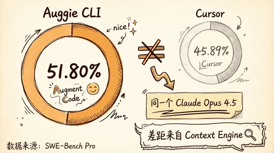两个数字来自 SWE-Bench Pro——一个由 Cursor 和 Scale AI 联合推出的编程基准测试,要求 Agent 自主定位真实 GitHub Issue、修改代码、通过测试。Auggie CLI 拿到 51.80%,Cursor 拿到 45.89%。